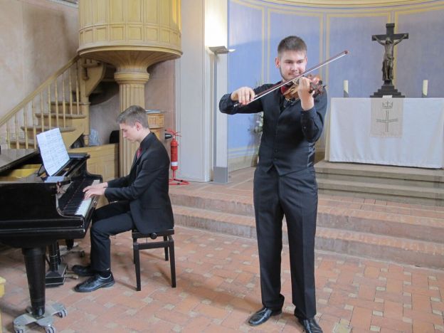 Die Violine, oder auch Geige genannt, ist ein viersaitiges Solo - und Orchesterinstrument. Ihr Klang gestaltet sich eher im oberen Bereich (Höhen) unseres Hörvermögens. Kinder, Jugendliche und Erwachsene haben durch verschiedene Größen von Instrumenten immer eine Möglichkeit, das Violinspiel im Gruppenunterricht als auch im Einzelunterricht zu erlernen. Unterrichtsliteratur gibt es für jedes Alter. Ziel ist: Geige spielen soll Spaß machen und die Kinder Jugendlichen und Erwachsenen für unsere Ensemble- und Orchesterarbeit begeistern.